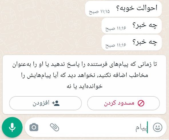 در بروزرسانی جدید واتساپ در صورتی که فرستنده در لیست مخاطبین مخاطب مورد نظر وجود نداشته باشد واتساپ اجازه نمایش تیک دوم و تیک آبی را به فرستنده نمی دهد طبق تصویر مقابل.